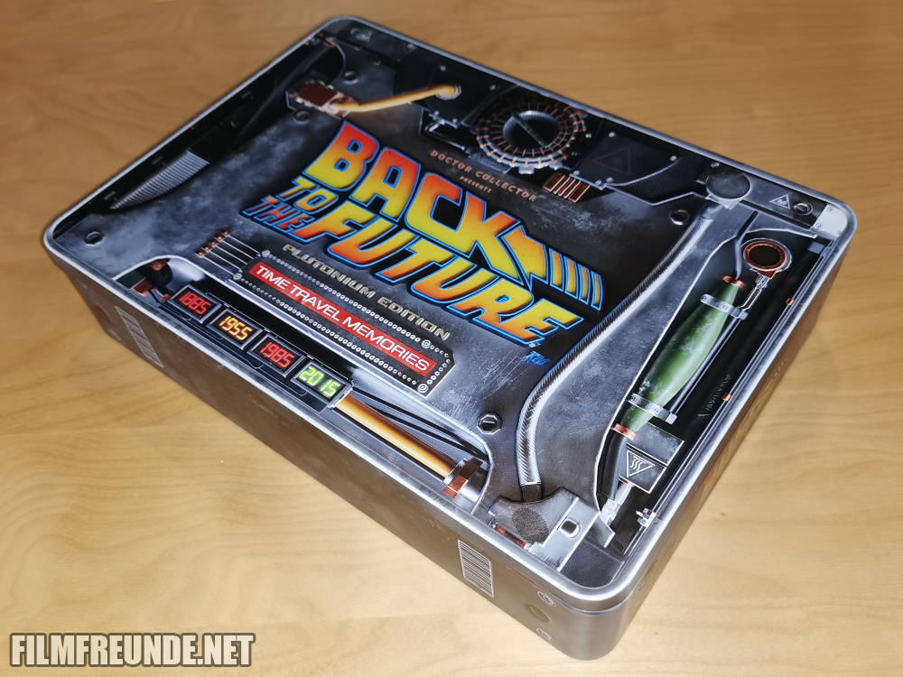 In einer schönen geprägten Metallbox finden sich 4 Umschläge/Tüten mit den jeweiligen Props der Jahre 1885, 1955, 1985(a) und 2015: